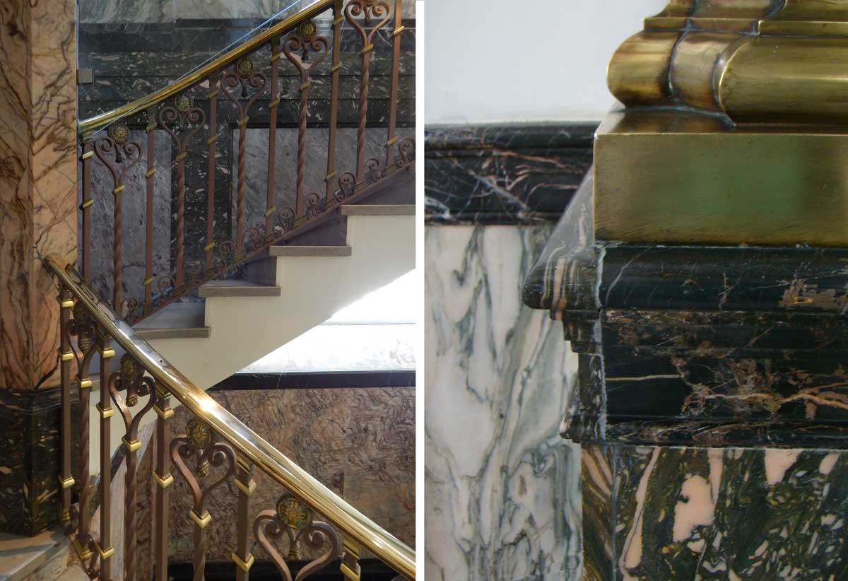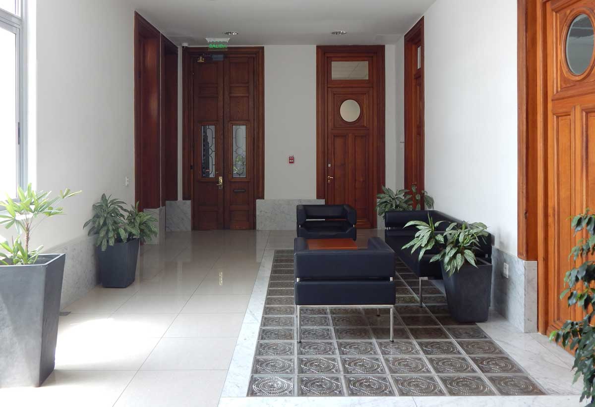 Para mejorar el confort físico de los colaboradores se trabajó en factores que se relacionan directamente con el bienestar psicológico y emocional de las personas como la luz y ventilación natural, las vistas al exterior, la utilización intencionada de los colores, la distribución del mobiliario de forma clara Y legible, y la introducción de vegetación en ciertos sectores. Se liberó el espacio de las plantas baja y primera generando divisiones transparentes para no perder la esencia del espacio original y a la vez permitir el pasaje de luz natural a los sectores alejados de las calles, generándoles así un relacionamiento visual con el exterior. Con la misma lógica, en las plantas altas se modificaron las divisiones interiores para adecuarlas a los requerimientos de uso y de mejor calidad espacial. El edificio contaba con una serie de materiales originales de excelente calidad que se recuperaron en su totalidad: mármoles, pisos monolíticos y de tablas de madera, molduras, carpinterías y elementos de herrería.