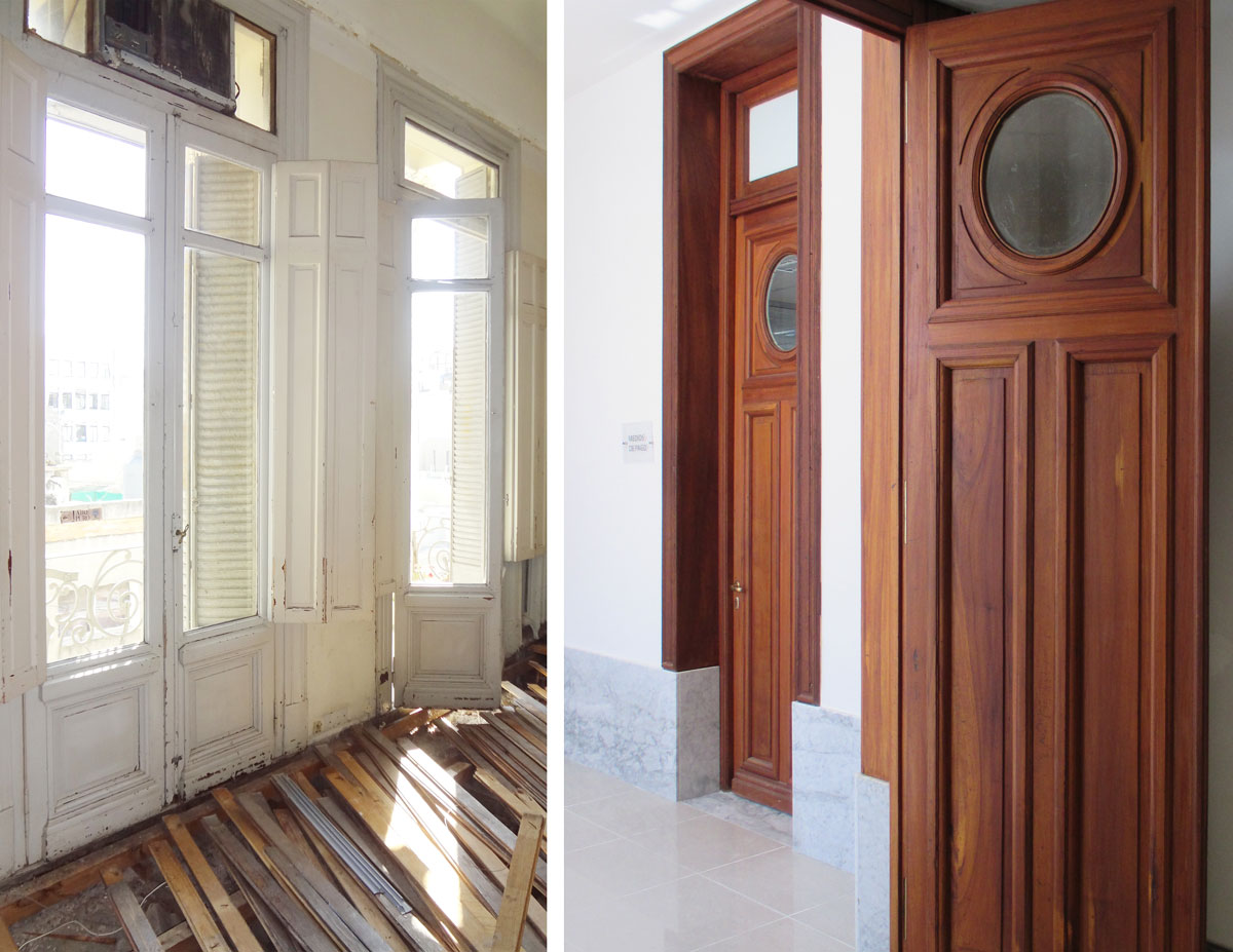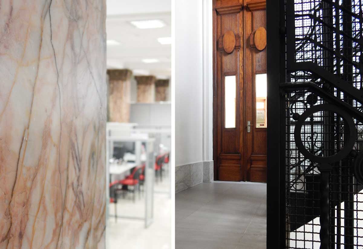 Cuando se nos encomendó la tarea reformar el edificio, la premisa fue adaptarlo a las tareas actuales que se desarrollaban, optimizando la calidad espacial y mejorando así el bienestar de los colaboradores del banco. El desafío fue lograr lo propuesto revalorizando la esencia del edificio original. Por eso buscamos resaltar y recuperar elementos preexistentes, así como el valor de las construcciones y espacialidades originales como el soporte para albergar nuevas distribuciones y equipamiento según estos nuevos usos y tareas.