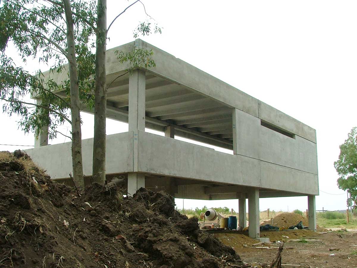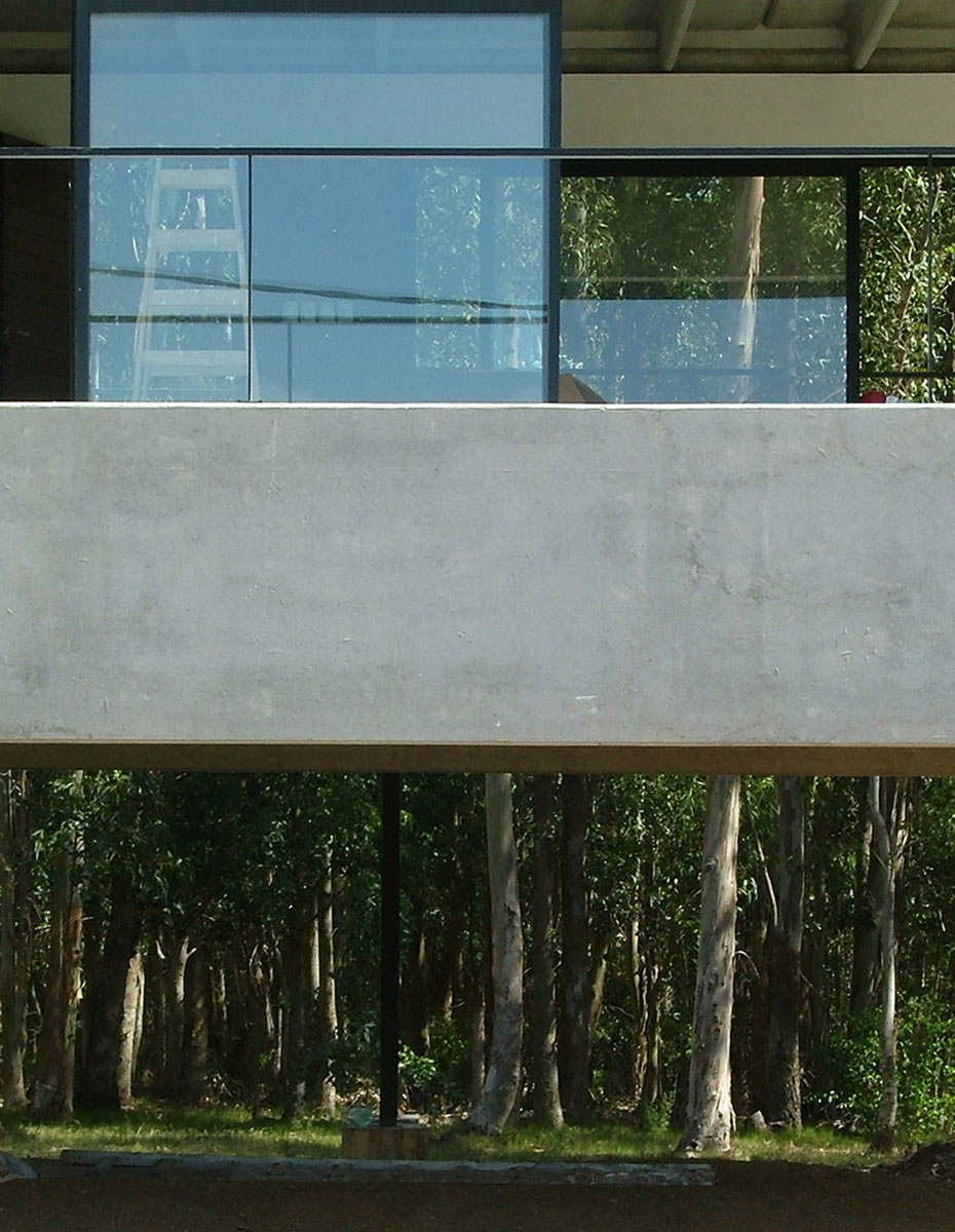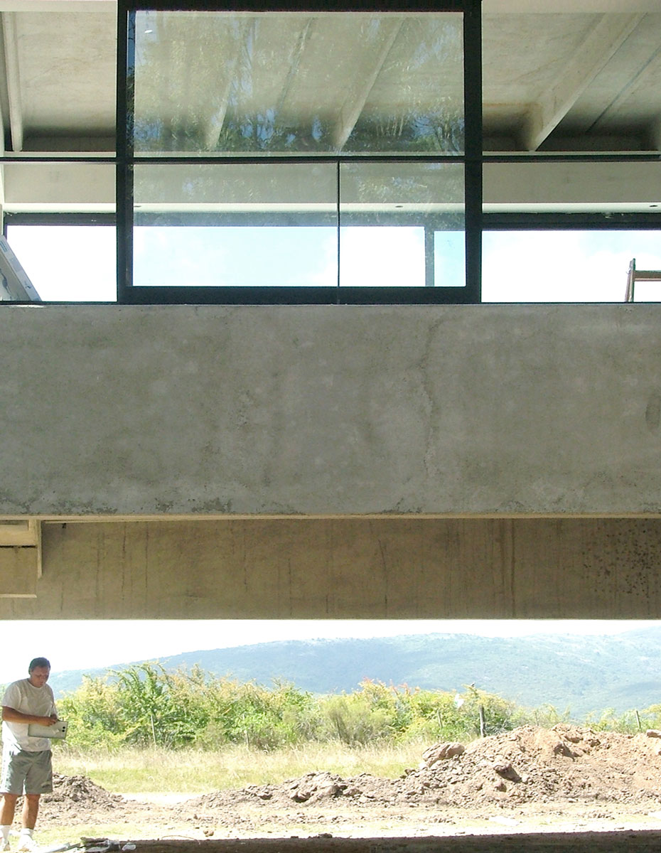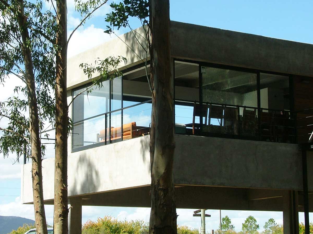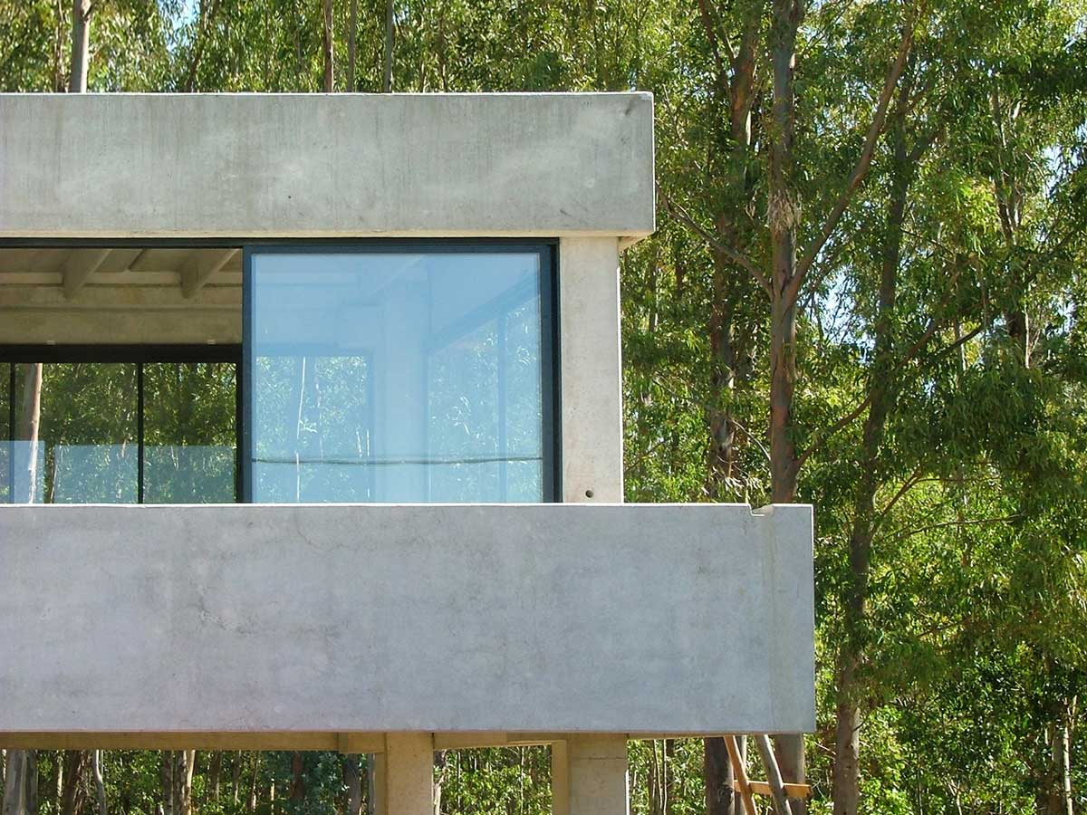 La transparencia proyectada hacia el paisaje exterior contrasta con la textura y peso de los paneles macizos de hormigón, realizados mediante un sistema integral premoldeado. Esta opción nos permitió tener la casa finalizada en un breve período de tiempo, ya que estructura y paredes se montaron en el sitio a través de un sistema de grúas en tan solo una semana. El predio no contaba con saneamiento, por lo cual se incluyó en el proyecto de instalaciones una planta de tratamiento de efluentes que purifica el agua residual y la filtra al terreno. Asimismo se contempló la recolección de agua para resolver el riego de la vegetación.