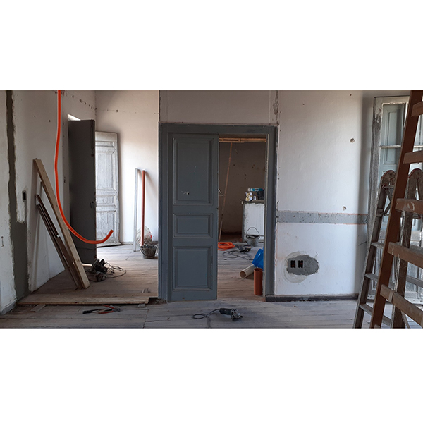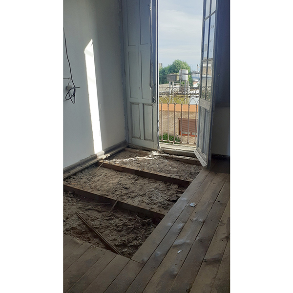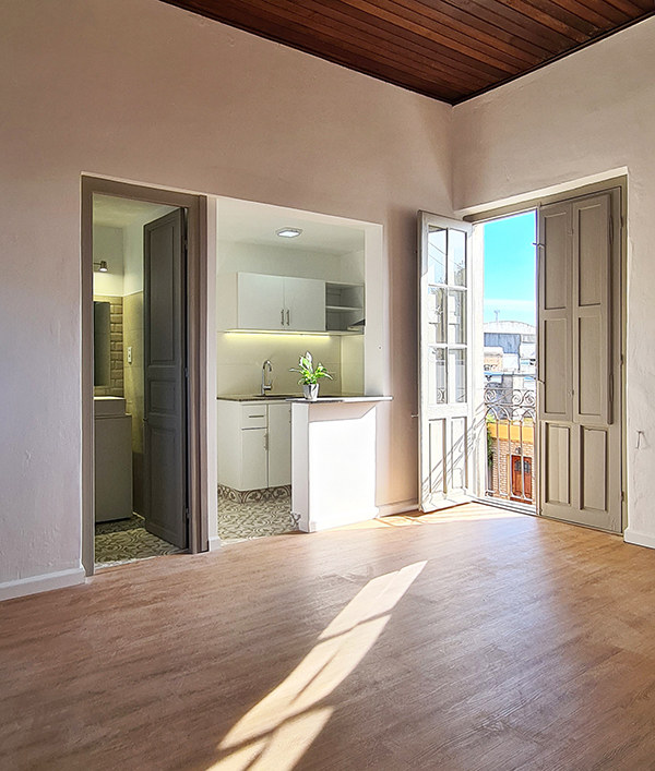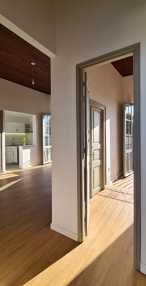 Entusiasmados con el resultado del reciclaje anterior, que llamamos “Canelones”, los propietarios nos encargaron renovar la vivienda ubicada en la planta alta del mismo padrón. La construcción se encontraba en muy mal estado de conservación, y tenía una distribución muy particular que consistía en una batería de habitaciones comunicadas entre sí y vinculadas con el sector de baño y cocina por una galería exterior. Decidimos convertir el sector de habitaciones en una vivienda de 2 dormitorios sin intervenir el sector de baño y cocina existentes, con la idea de convertirlos en una nueva unidad en el futuro.