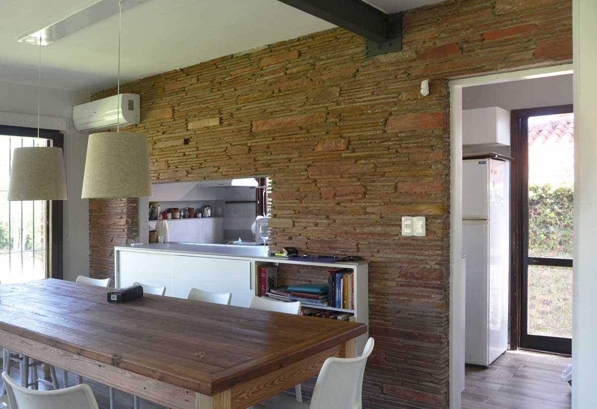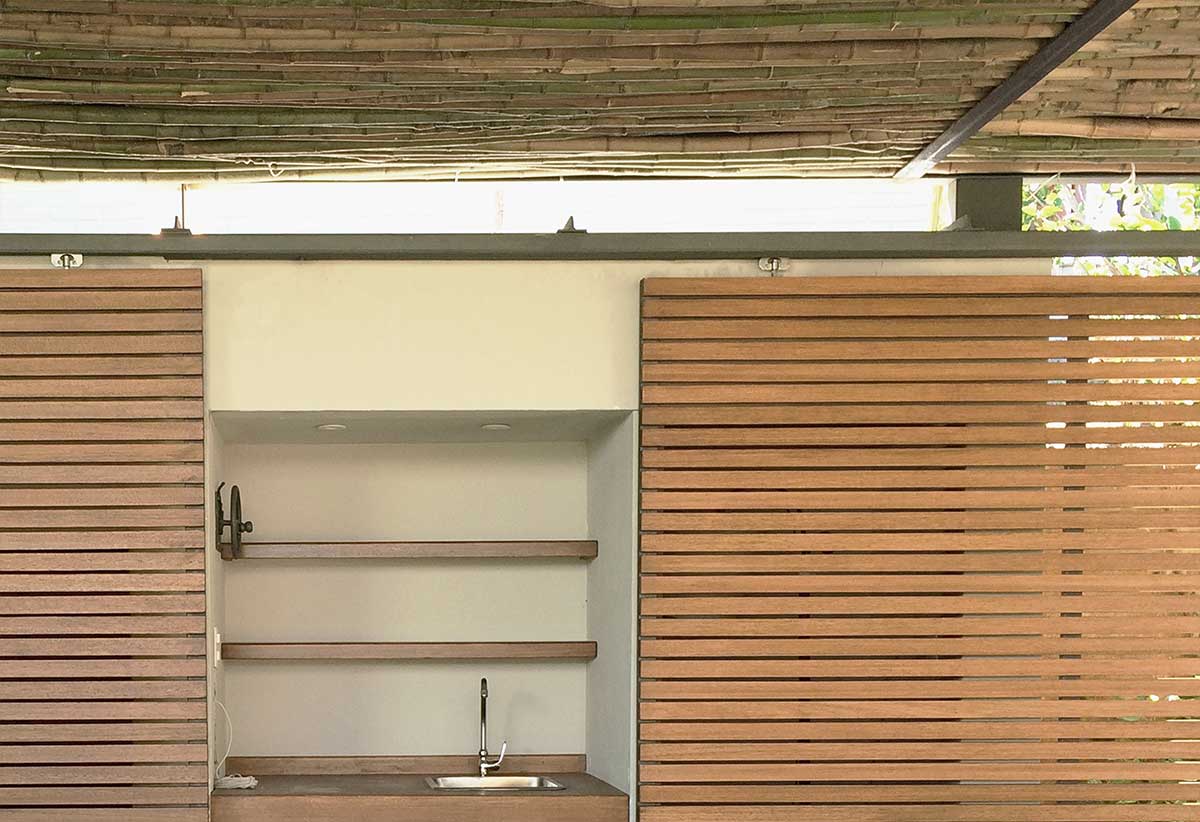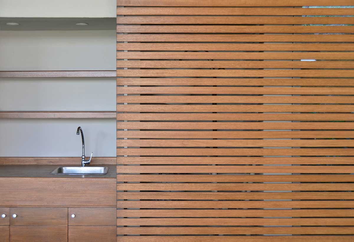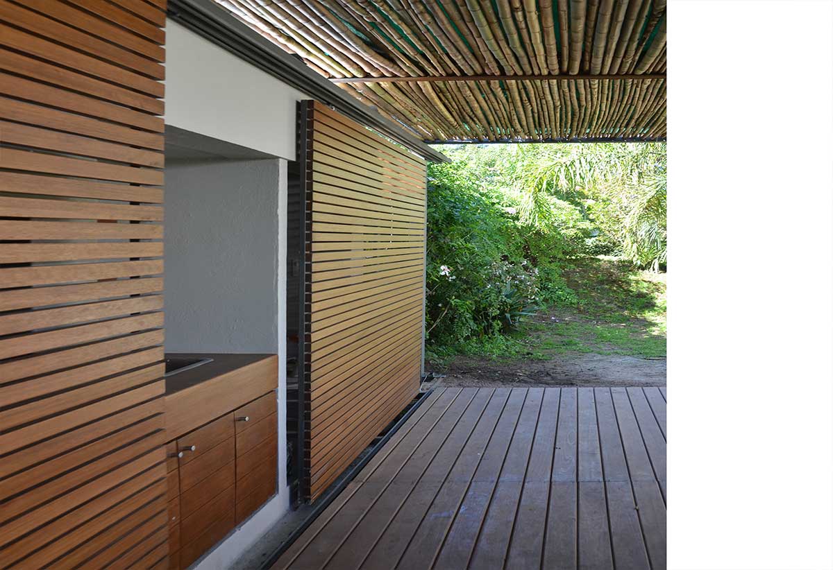Al interior de la vivienda se unificó el living-comedor, antes compartimentado, y se rediseñó el espacio de cocina. La vivienda existente se recicló en su totalidad, renovando baños, cocina, pisos e instalaciones, pero conservando aberturas de madera y la fachada exterior de ladrillo visto, característica de la construcción. El estar exterior se integra al jardín a través del uso de materiales naturales como madera y caña. La parrilla y cocina se ubican detrás de un panel corredizo de madera, esto permite cerrarlo para protegerlo de la intemperie, o abrirlo para su uso, flexibilizando este espacio clave para la vida familiar en verano.