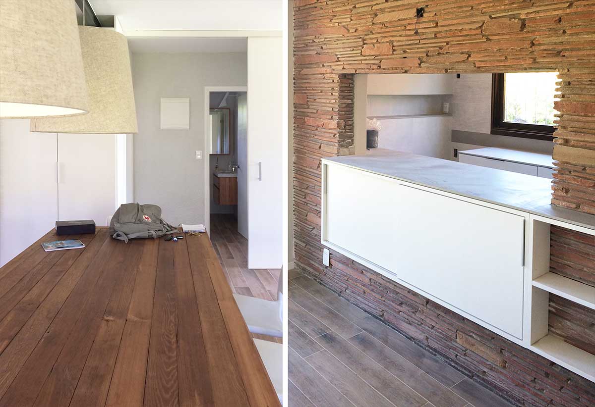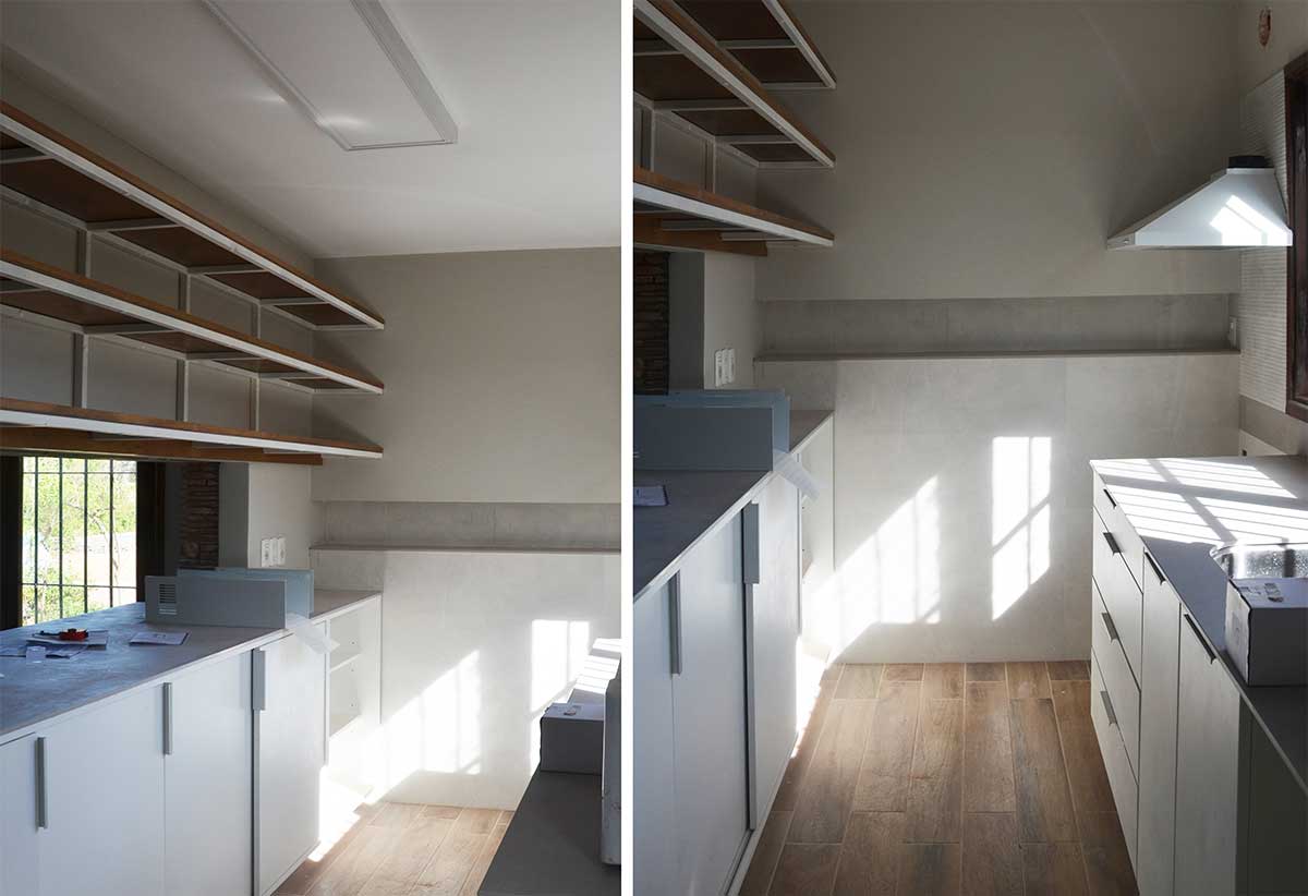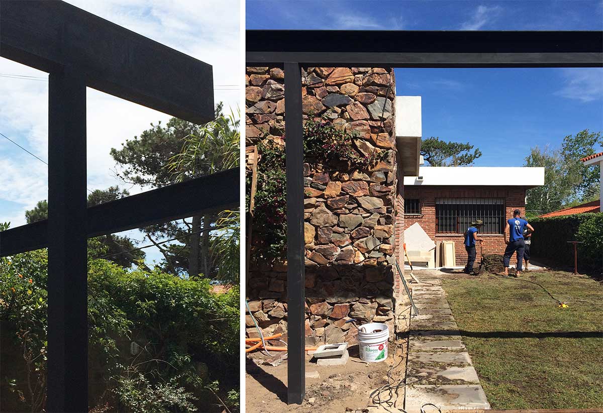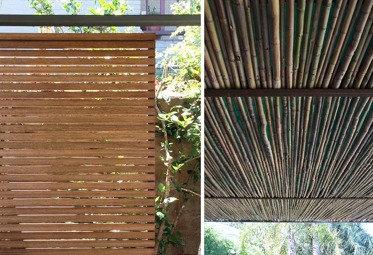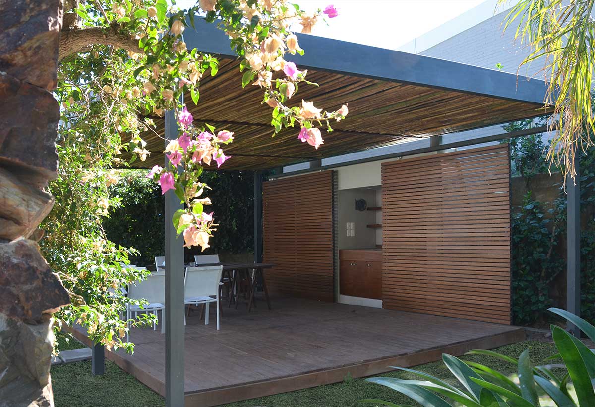 Al interior de la vivienda se unificó el living-comedor, antes compartimentado, y se rediseñó el espacio de cocina. La vivienda existente se recicló en su totalidad, renovando baños, cocina, pisos e instalaciones, pero conservando aberturas de madera y la fachada exterior de ladrillo visto, característica de la construcción. El estar exterior se integra al jardín a través del uso de materiales naturales como madera y caña. La parrilla y cocina se ubican detrás de un panel corredizo de madera, esto permite cerrarlo para protegerlo de la intemperie, o abrirlo para su uso, flexibilizando este espacio clave para la vida familiar en verano.