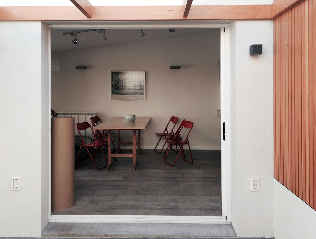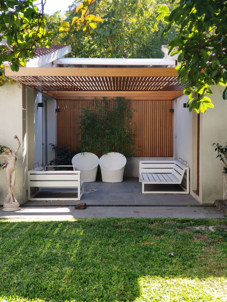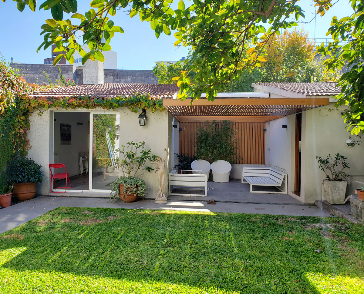 La última etapa comprendió la reforma de las construcciones que estaban subutilizadas al fondo del padrón, redefiniéndolas en un área de servicio (sala de lavado y planchado, sector de secado al exterior y baño de servicio) y una barbacoa. La colocación de ventanas con apertura total y el diseño de una nueva pérgola de madera permitió formalizar una extensión natural de la barbacoa hacia un estar exterior. Acondicionamos este espacio y el resto del jardín mejorando circulaciones y agregando pavimentos que lograran mejor conectividad con la vivienda principal y un mayor aprovechamiento del espacio exterior.